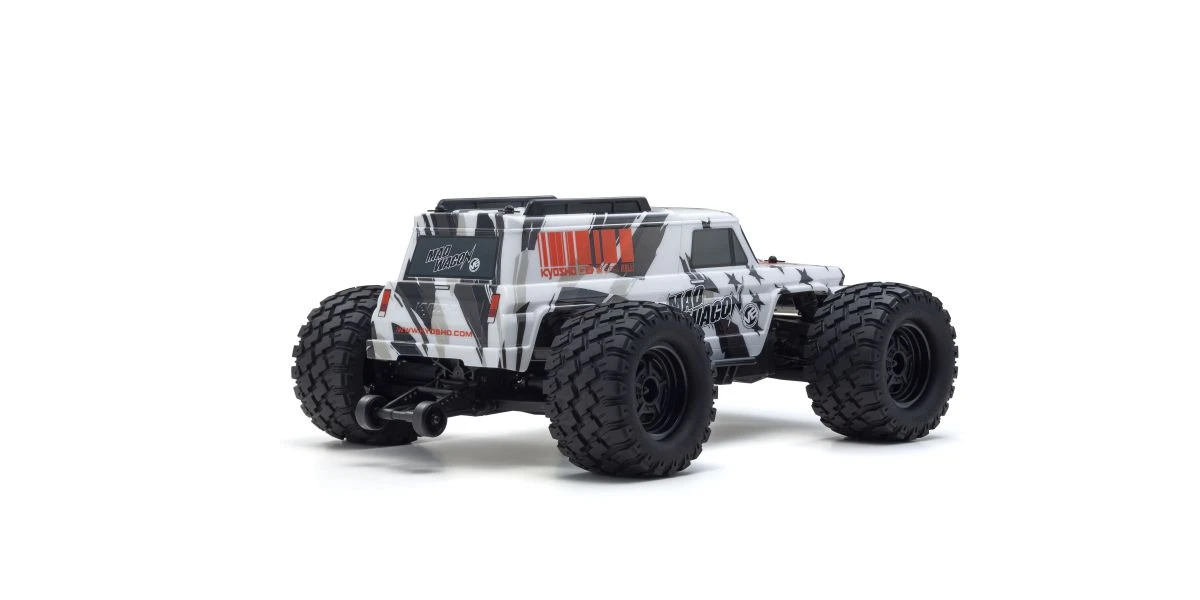 The Monster Truck, otherwise referred to as the ‘Basher’ category, has grown in popularity over many generations. With a pickup truck body mounted on a tough chassis and large diameter tires, monster trucks including R/C model versions, are built to go anywhere from the badlands to stadium courses. Now the Mad Wagon VE puts a unique style on a brute R/C machine! The completely new KB10 4WD chassis design is compatible with 3S (11.1V) high-power lithium polymer (LiPo) batteries and features a newly developed brushless motor and speed controller as standard. Delivering an optimal balance of high-speed and power, the aluminum main chassis of the KB10 combines front/rear blocks incorporating a split frame and double wishbone suspension to drive the all-terrain 2.8” wheels and tires. As the tire size is compatible with standard wheels, you can vary specifications to suit the type of road surface and conditions. In addition, drivetrain parts are shared with the 1/8 scale Inferno NEO ST 3.0, providing more than enough capacity for a 1/10 scale machine. The original 1980’s style van body design is produced in ‘Ultra Scale’ realism. While the body included in the kit is pre-painted, you could create your own custom body coloring design with a clear body as well as elevating the realism with the optional LED light unit (No.97054-4B). The Mad Wagon VE is packaged as a pre-assembled Readyset and requires only batteries for the chassis and charger to get up and running. A wide range of optional parts are available to expand and extend your enjoyment of the R/C car hobby.