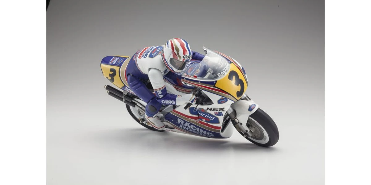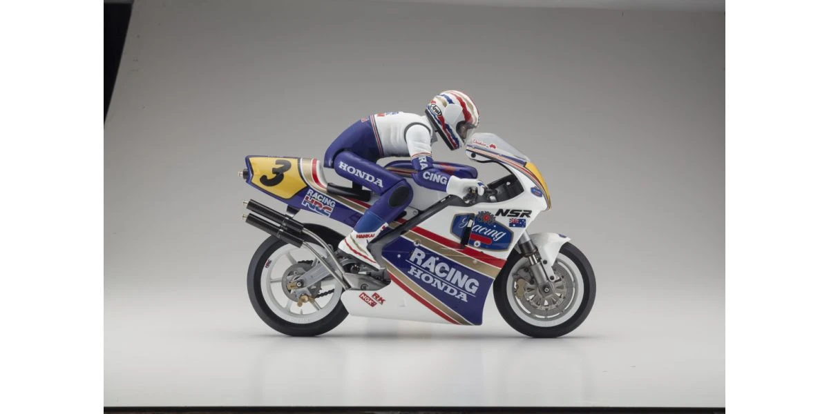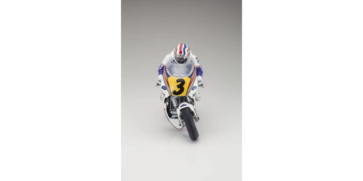 Since it’s first release in 1992, Kyosho’s long selling Hanging On Racer model is still as popular as ever. The S.D.S.S (semi direct steering system) delivers high performance fully independent motion with the rider figure construction incorporating 13 different connections so it hangs on to the bike as it leans into corners. The result is driving performance just like a real motorbike that is easy enough for anyone to control. In addition, each section of the bike is designed with an incredible level of scale detail from the body cowl, inverted front fork suspension, brake disk & calipers, wheels, drive chain, sprocket and asymmetrical swing arm to recreate a model of display standard quality. However, as only a few parts are used in construction, even beginners can enjoy the satisfaction of the assembly that only takes a short time to complete. Dive deep into the fascinating realm of R/C electric motorbike driving like never before and discover the pure enjoyment of building, displaying and driving your own Hanging On Racer.