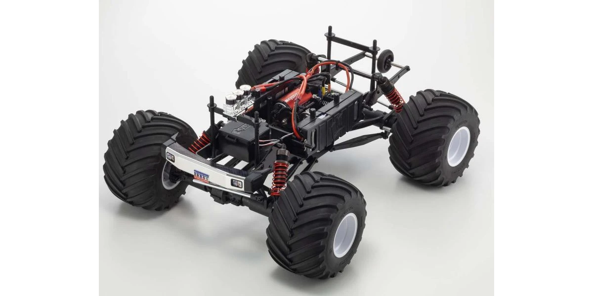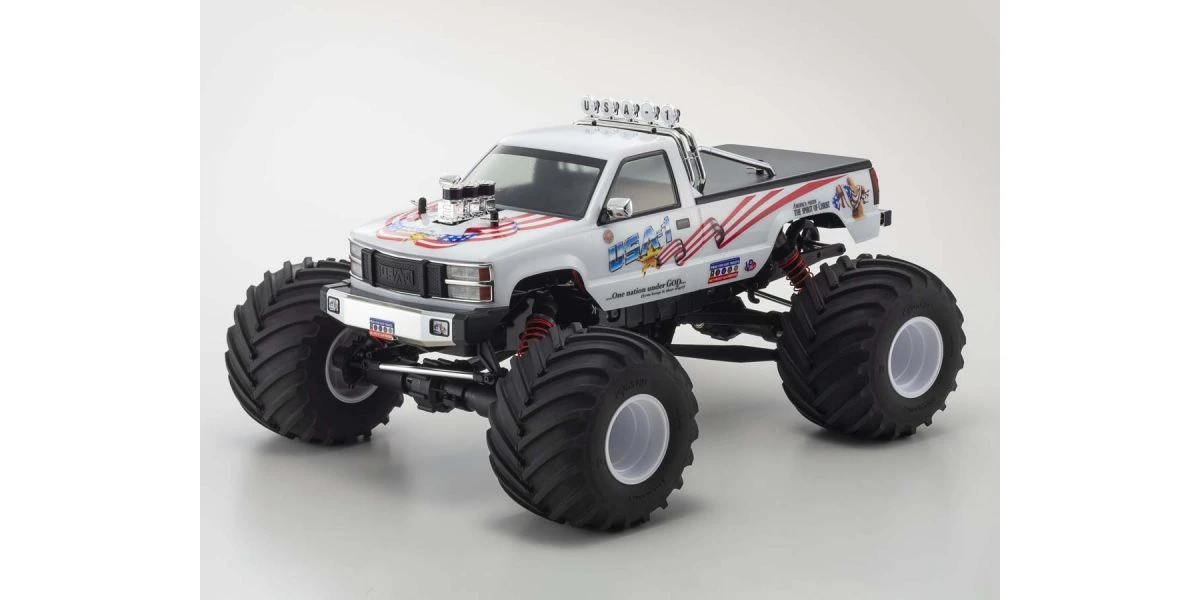 Born in the USA, the monster truck symbolizes America: big, bold and powerful! With pickup truck bodies emblazoned with dynamic motifs mounted on super tough chassis structures and big engines to power huge tires, monster truck racing filled and thrilled stadiums around America and the world with their awesome power and speed. Recreated in 1/8 scale as an R/C truck, the “USA-1” flies the American flag loud and proud as the recognized symbol of monster trucking. Dating back to the 1990’s, Kyosho’s earlier versions have been fully renewed with a newly created ULTRA SCALE body, uniquely reinforced 5-link suspension and stronger solid axles originally used on the Mad Crusher and FO-XX 2.0. Equipped with a high-power brushless motor with a 4-pole rotor and 12-slot stator generating 2300KV, the VE (electric power version) delivers outrageous speed and power characteristics that would rival that of the real USA-1. The high-powered unit produces dynamic performance that makes the large 570mm body length of the USA-1 feel smaller with acceleration pickup from a standing start surpassing that of the GP (engine powered) version. As a pre-assembled Readyset, the body is immaculately finished with paint and livery to capture the rich sense of scale of this iconic 1990’s machine. A charged motor battery and batteries for the transmitter are all that is required to start the action. With spare parts and a wide range of optional parts available to continually maintain and enhance performance, your USA-1 will provide thrilling fun over a long time.